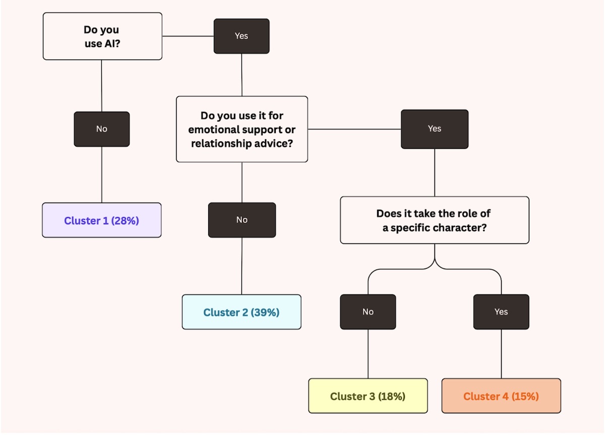 Clusters 3 and 4 surely also use AI for other things, but given that the study is primarily examining the impact on relationships, these clusters were created accordingly.